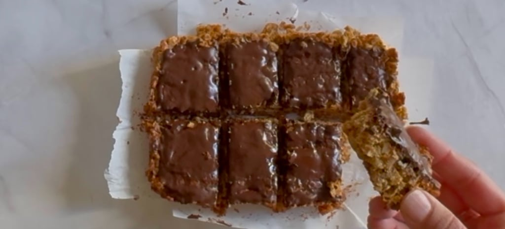 Once baked, immediately place one piece of dark chocolate on each bar section.